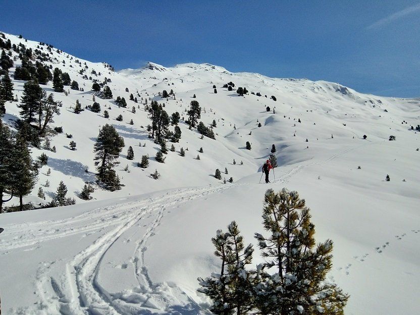 Einige Schlucke heißen Tee später treffen nun endlich alle Naturfreunde zusammen. Die folgende Strecke ist deutlich windstiller und führt an der Speckalm vorbei hinauf zum Vogelsang. Endlich kommt die Abfahrt, auf die sich alle so gefreut haben. Feinster Schnee und eine warme Einkehr auf der Speckalm runden diese schöne Skitour ab. Alle Zweifel sind vergessen.