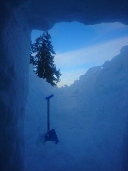 Klaus buddelte in der Zwischenzeit im Schnee und baute unter Hilfenahme seiner Eissäge eine mannshohe Schneehöhle die uns einen windge-schützten und „warmen“ Gemeinschaftsraum bot. Die Zeit verging wie im Flug mit Teewasser kochen und nach und nach Schnee für diverse gefrierge-trocknetes Trockenfutter zu schmelzen.