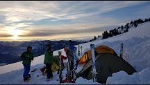 vorhandenen zwei Zelte aufgebaut. Robert und sein „Damenzelt“ fehlten jedoch noch also galt es die Zeit zu überbrücken. Ein Sonnenuntergang am Gipfel sollte es für Susi sein. Da wir aber noch reichlich Zeit und super Pulverschnee hatten fuhren wir erst zur „Last Hütte“ ab um dann eine Sonnenuntergang Punktlandung zu setzen. Hut ab vor Florian, der ja als einziger alles mit Schneeschuhen ging.